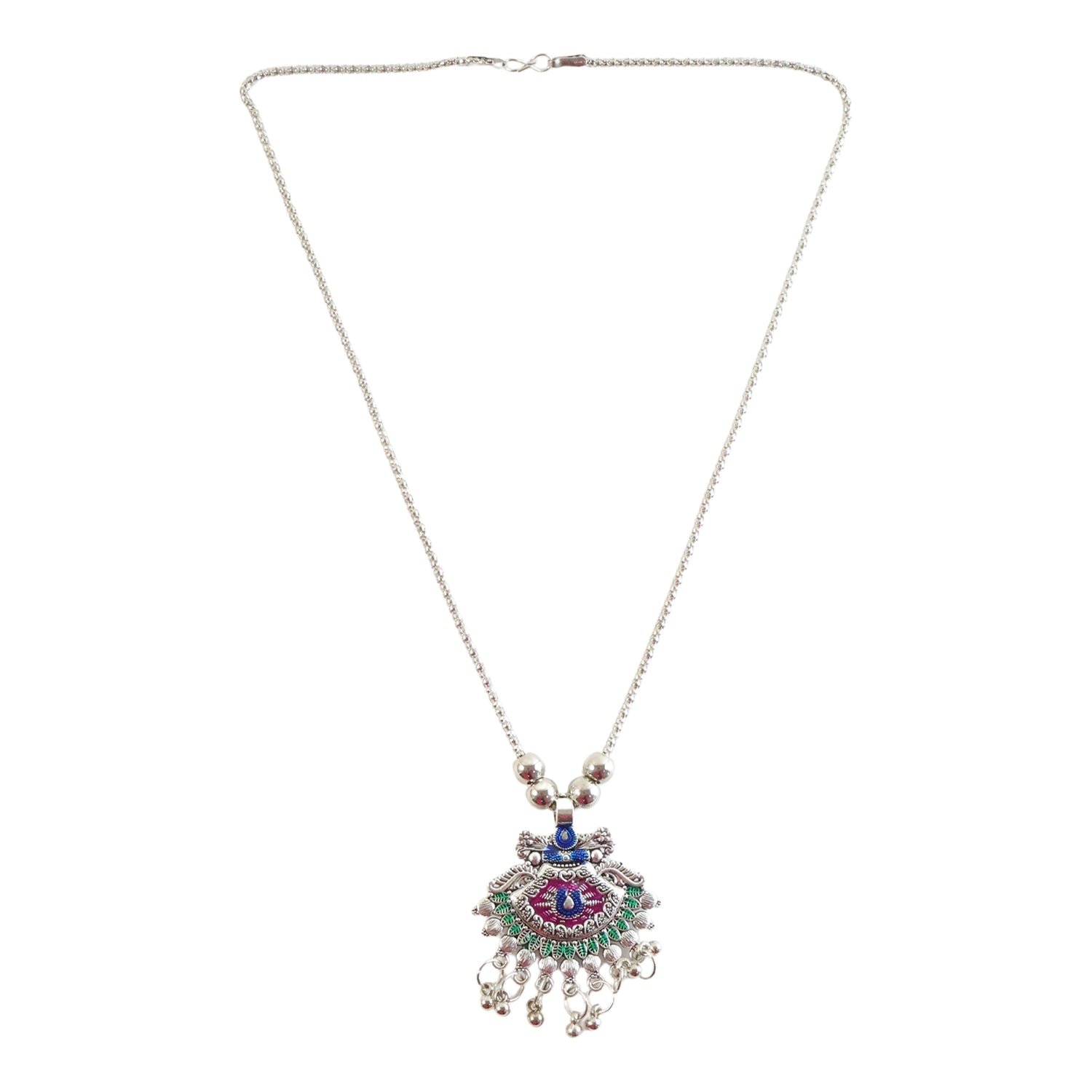 This beautifully crafted oxidised necklace is a stunning blend of traditional artistry and modern elegance, designed to elevate any outfit with its statement-making presence. The long chain features a rich antique finish with bead detailing that complements the intricate pendant inspired by temple jewellery motifs. The pendant showcases detailed carvings, colourful enamel accents, and multiple dangling charms that create graceful movement and add depth to the design. Every element of this necklace is handcrafted to reflect heritage craftsmanship while ensuring it remains lightweight and comfortable for long wear. Whether paired with ethnic outfits, festive attire, or Indo-Western styles, this necklace adds sophistication, charm, and a distinctly artistic touch to your personal style.