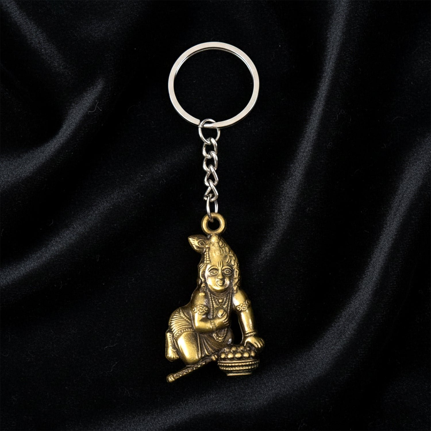 Premium Antique-Gold Metal Bal Krishna Makhan Chor Keychain – Divine Baby Krishna Eating Butter Idol Keyring for Car, Bike, Home & Auspicious Gifting (1 Pc)