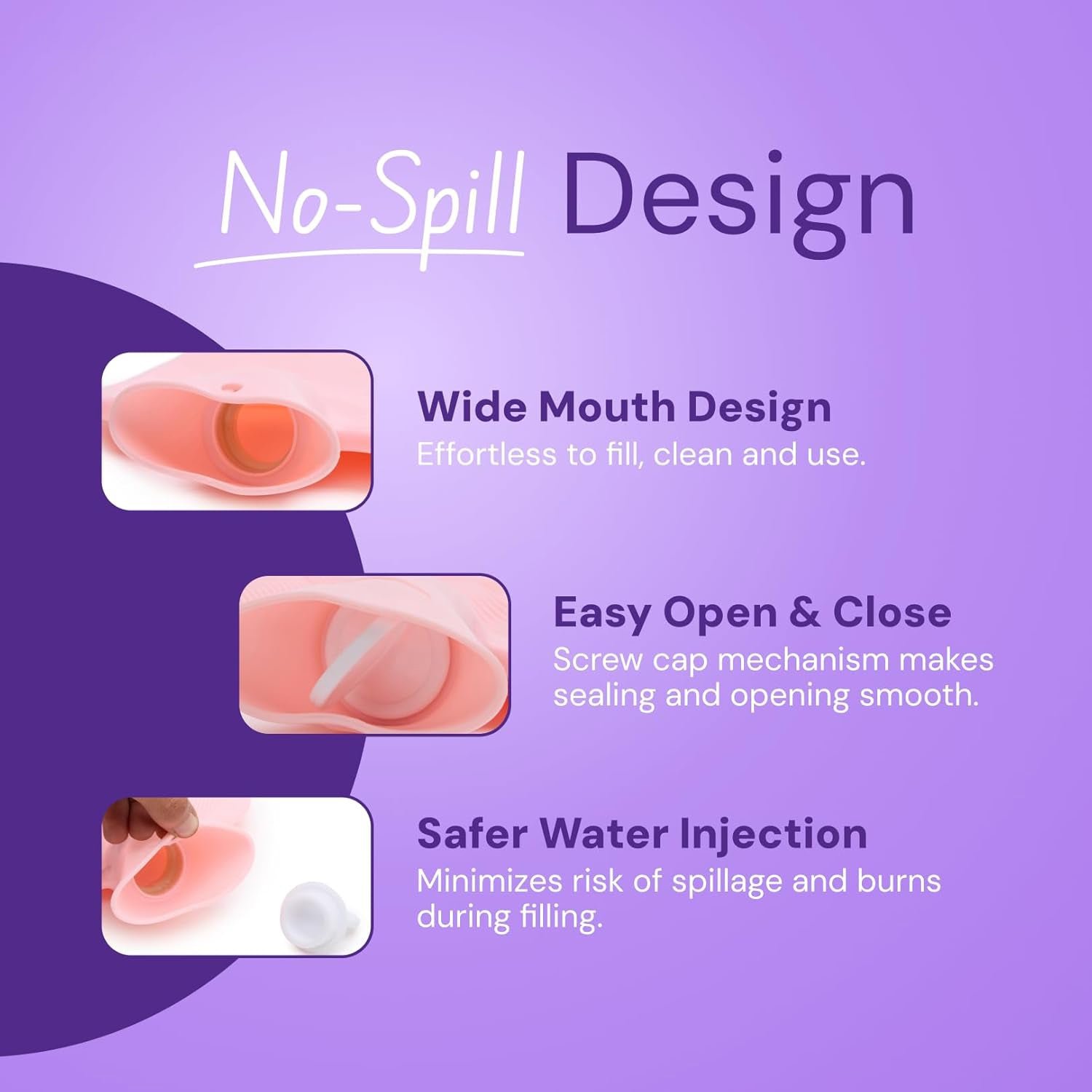 Its 31×19 cm large size ensures better coverage for areas like the back, stomach, neck, legs, and shoulders. The textured, anti-slip surface helps distribute heat evenly while preventing the bottle from slipping during use. The wide mouth design enables easy filling, and the secure leak-proof cap ensures safe usage.